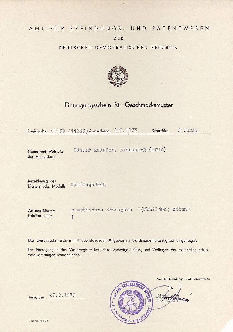Günter Knüpfer reichte am 6. Aug. 1973 einen Antrag für ein Geschmacksmuster eines »Kaffeegedeck«s beim Amt für Erfindungs- und Patentwesen der DDR, Berlin, ein. Bewilligt wurde dies für 3 Jahre am 27. Sept. 1973.