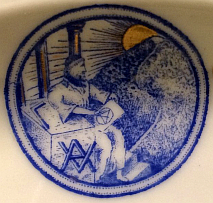 • Dekor: Logo der Eisenberger Loge »Archimedes am Waldeshügel«, Goldstreifen auf Tellerfahne