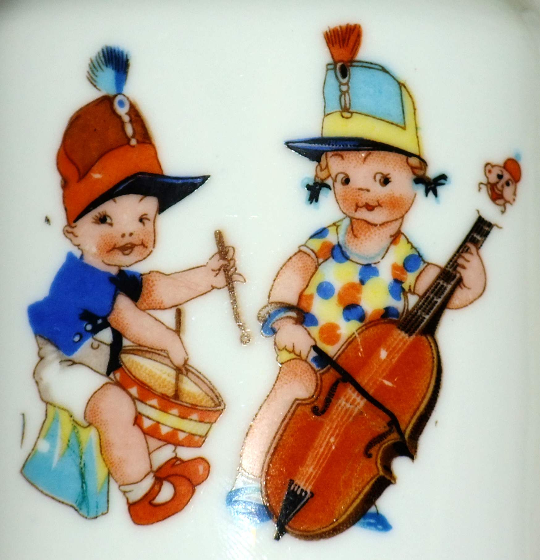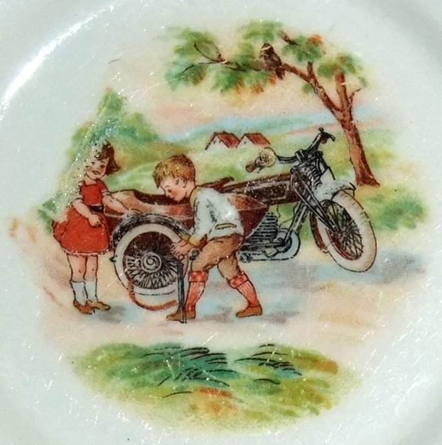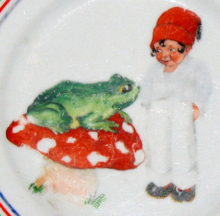 Nachfolgend eine kleine Auswahl an Motiven, wie sie in den 1930er Jahren auf Kindergeschirr dekoriert wurden. Die Bildchen wurden mittels Verschiebetechnik - nassmachen, auflegen, schieben und Luftbläschen entfernen - montiert. Diese gedruckten Bildchen wurden von einem Zulieferer gekauft und entsprechend finden sich diese Motive auch bei anderen Porzellanherstellern - vor allem im thüringer und oberfränkischen Raum.