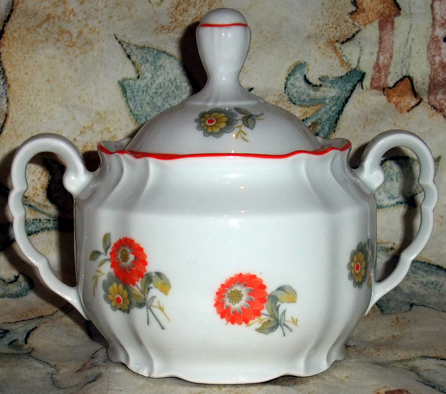 Porzellanfabrik Kalk in Eisenberg/Thüringen • Seriengeschirr: Form „Ernst“ 1932 • Dahlienblüten, rot, gelb, grau