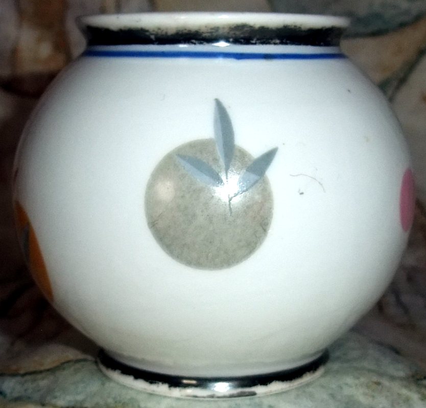 Porzellanfabrik Reinecke in Eisenberg/Thüringen • Form: 234 (Vase) • 4606 (rote Tulpe, rosa, orange, graue Kreise, Schwarzband, Blaurand)