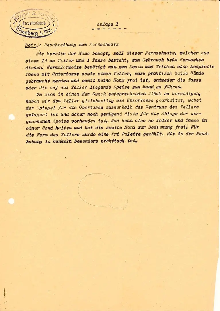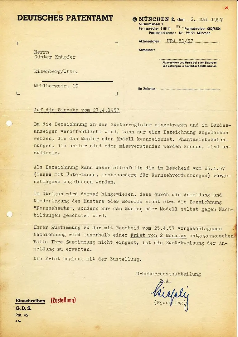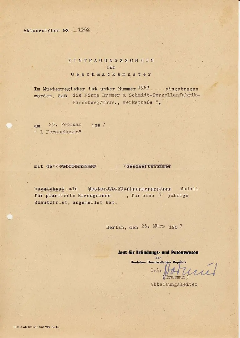 Günter Knüpfer reichte zum 25. Febr. 1957 einen Gebrauchsmusterantrag für ein Tassen-/Untertassen-Set - bezeichnet als »Fernsehsatz« - beim Amt für Erfindungs- und Patentwesen der Deutschen Demokratischen Republik, Berlin zur Registrierung ein. Der Antrag wurde am 26. März 1957 in Form einer Eintragung als Geschmacksmuster im Musterregister bewilligt.