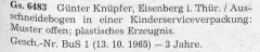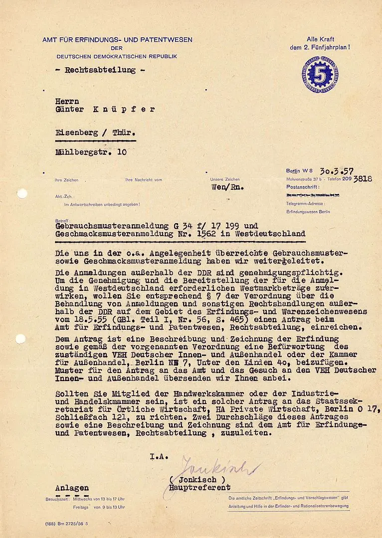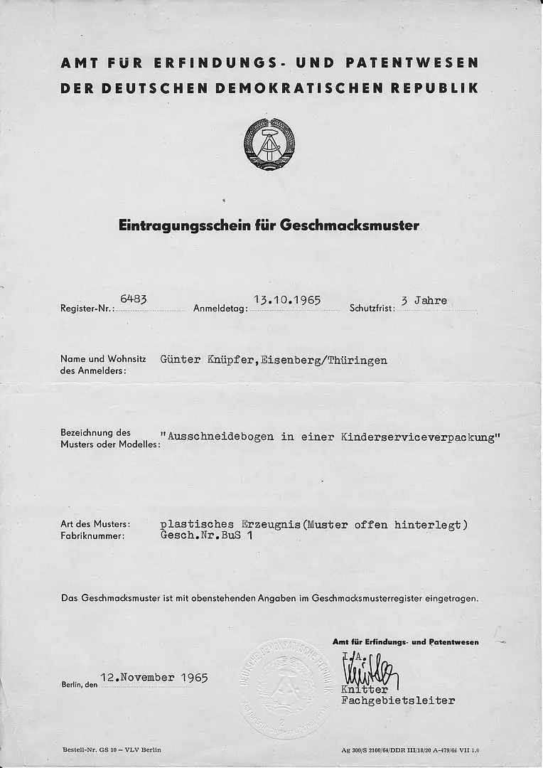 Günter Knüpfer reichte am 13. Okt. 1965 ein Geschmacksmusterantrag für den »Ausschneidebogen in einer Kinderservicepakung« beim Amt für Erfindungs- und Patentwesen der DDR, Berlin, ein. Mit Eintragsschein wurde am 12. Nov. 1965 das Geschmacksmuster für 3 Jahre bewilligt.