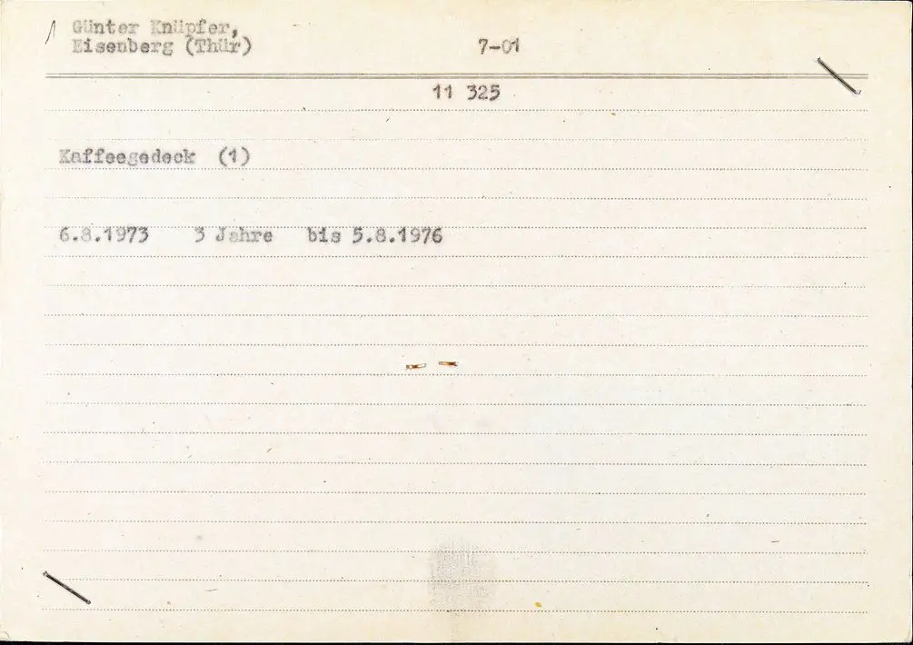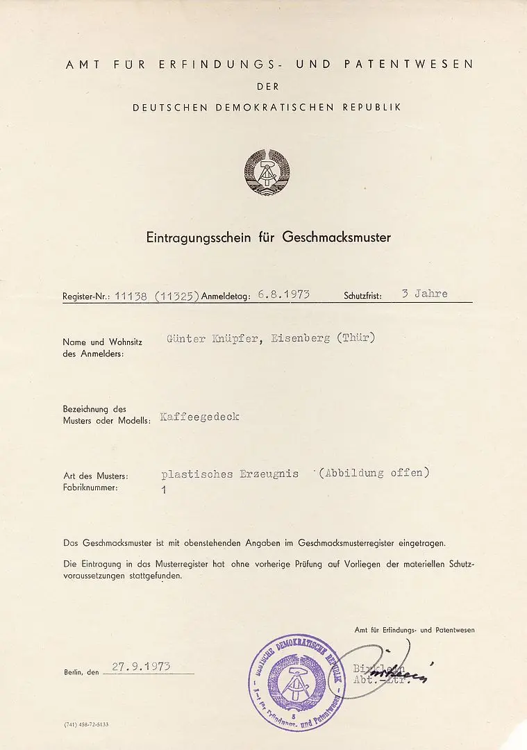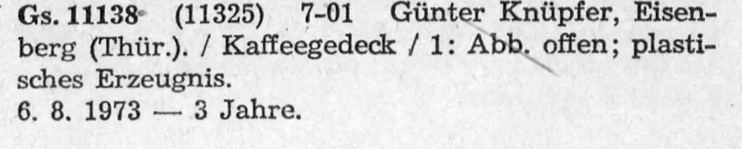 Günter Knüpfer reichte am 6. Aug. 1973 einen Antrag für ein Geschmacksmuster eines »Kaffeegedeck«s beim Amt für Erfindungs- und Patentwesen der DDR, Berlin, ein. Bewilligt wurde dies für 3 Jahre am 27. Sept. 1973.