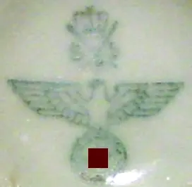 (1) Behördenkennzeichnung: Wehrmachtsadler. Vermutlich wurde Geschirr für Erholungseinrichtungen von Wehrmachtsangehörigen so gekennzeichnet.
