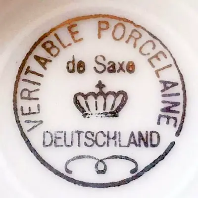 (2) Diese Porzellanmarke wurde möglicherweise gezielt für den Exportmarkt gestempelt - VERITABLE PORCELAINE de Saxe - echtes Porzellan aus Sachsen.